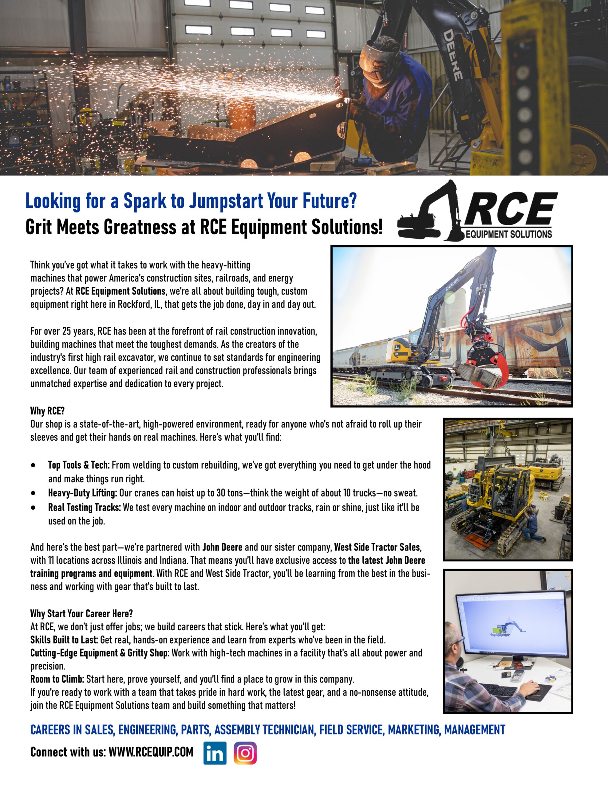 At RCE Equipment Solutions, you’re not just punching a clock – you’re building machines that keep America moving. This is a place where hard work and hands-on craftsmanship matter. Whether you’re designing gear or getting your hands dirty putting together tough-as-nails rail equipment, you’re part of a crew that gets things done. It’s no frills here, just solid work with a team that’s got your back. You’ll see your ideas turn into real-world tools that last, all while learning, growing, and taking pride in the machines you help build. If you’re ready to roll up your sleeves and get to work, this is the place for you.